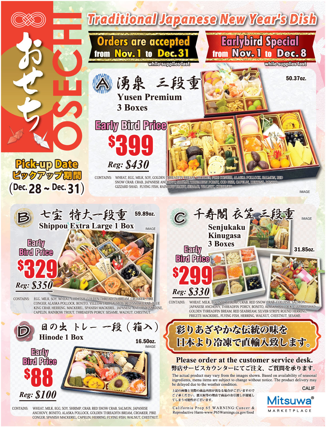 From 11/1-12/8, Mitsuwa will host an “Early Bird Special” advanced reservation of Osechi — a traditional Japanese New Year’s dish that involves a unique assortment of small meals. Each delicious dish is specially crafted to represent an individual value such as longevity, good health, and prosperity for families in the coming new year.