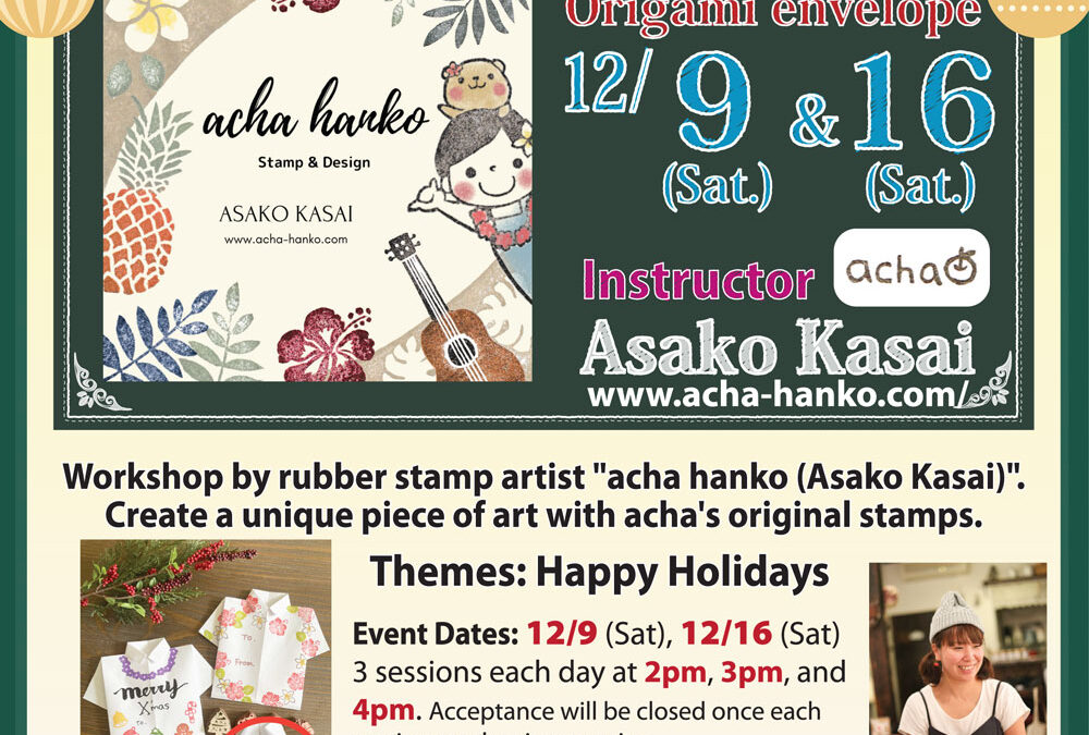 Workshop by rubber stamp artist “acha hanko (Asako Kasai)”. Create a unique piece of art with acha’s original stamps.