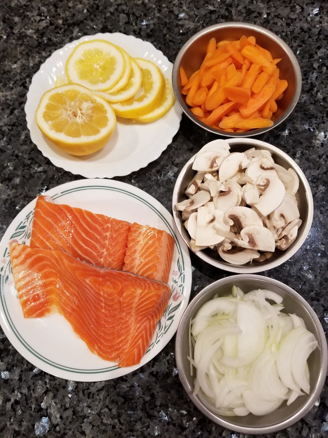 Mix all veggies together with salt and pepper and olive oil. Layer the veggies in the center of the foil, a little larger size than the salmon.